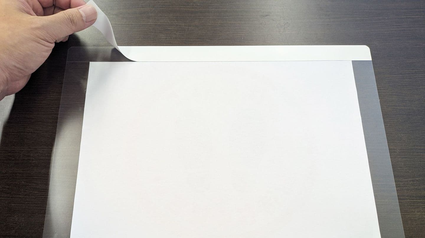 印刷物を残した剥離紙に当てがって粘着面の中心に置きます。裏側のスリットは長辺端部から2.0cmに部分に入れてありますので、印刷物の位置合わせにご利用ください。